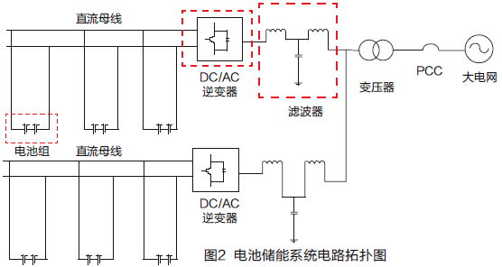 儲能系統(tǒng)調(diào)度算法是能否發(fā)揮儲能系統(tǒng)最佳作用的關鍵。一般電池儲能系統(tǒng)主要由儲能電池組、變流器、控制裝置和變壓器組成。圖2是儲能系統(tǒng)的電路拓撲圖。
