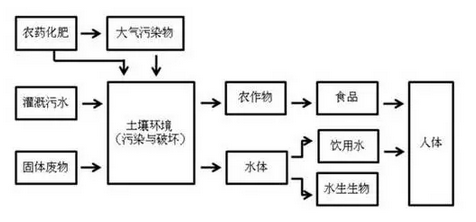 土地受到污染后,含污染物濃度較高的表土容易在風里和水力的作用下進入到大氣和水體中,這些污染物通過食物鏈最終影響人體健康。