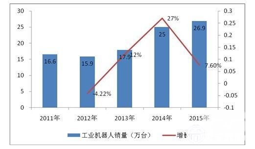 2014年全球工業(yè)機器人總銷量為25萬臺,同比增長27%,2015年全球工業(yè)機器人總銷量為26.9萬臺,汽車、電子、金屬等應用行業(yè)仍然是機器人最大的市場占有領域。2012年至2016年全球工業(yè)機器人2013年至2016年復合增長率約為6%。