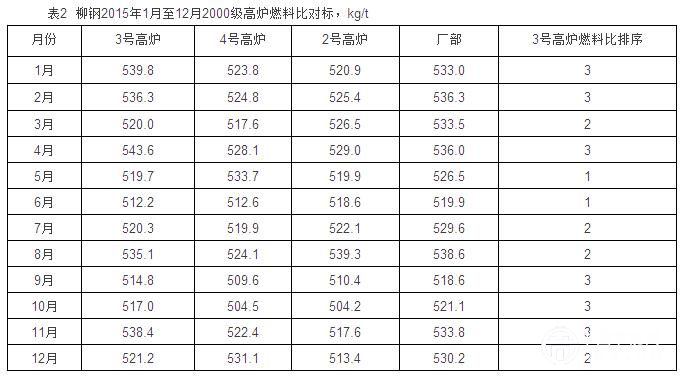 2008年兩座2000m3高爐建成投產(chǎn)(3、4號高爐),柳鋼跨入2000m3級大高爐生產(chǎn),2012年9月2650m3高爐(2號高爐)建成投產(chǎn),從此該廠擁有三座2000m3級高爐。表1是2009年至2015年7年生產(chǎn)時間2000m3級高爐燃料比、全廠燃料比對標表。表1顯示3號高爐燃料比在3座2000m3級高爐排序中處于末位,與指標較好的同類型高爐相比存在較大差距。