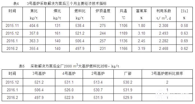 該爐經(jīng)過三個月實際運,對主要經(jīng)濟技術(shù)指標進行對標分析。表4是該高爐去年11月至今年2月的主要經(jīng)濟技術(shù)指標,表5是全廠2000m3大高爐燃料比對標。從表4、表5中看出,該高爐主要經(jīng)濟技術(shù)指標持續(xù)改善,燃料比逐步躍升為全廠第一名,今年2月份燃料比達到497.9kg/t歷史最好水平,實踐證明該解決方案達到了預效果。