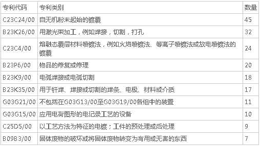 從我國再制造產(chǎn)業(yè)的專利技術(shù)申請分布來看,C23C24/00分布量最多,擁有45個專利技術(shù);其次是B23K26/00、C23C4/00,分別有32個和24個。