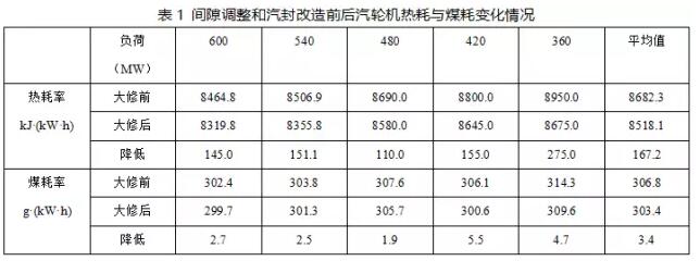 表1所示為對(duì)機(jī)組進(jìn)行間隙調(diào)整和布萊登汽封改造后.利用耗差分析確定的不同工況下汽輪機(jī)熱耗和煤耗變化情況。