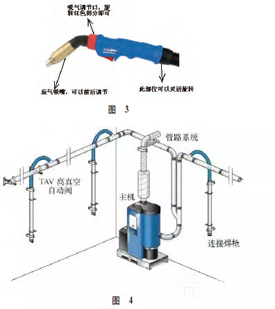 (1)使用方法焊接時(shí)把原有的普通焊槍換成環(huán)保焊槍(吸煙焊槍),如圖3所示。另外用軟管和鍍鋅鋼管連接到高負(fù)壓的主機(jī)上面即可,如圖4所示。