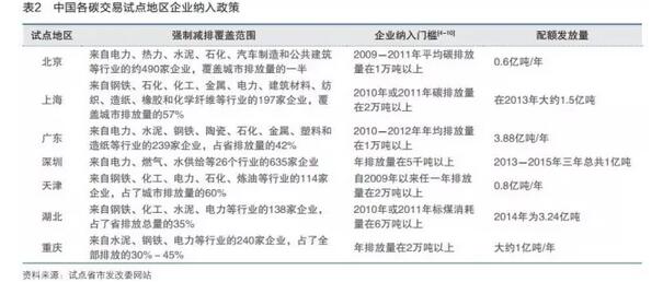 在市場(chǎng)容量和覆蓋企業(yè)上,各個(gè)試點(diǎn)地區(qū)因?yàn)榻?jīng)濟(jì)規(guī)模和產(chǎn)業(yè)結(jié)構(gòu)的不同,會(huì)有不同的碳交易政策,具體情況見表2。