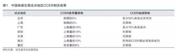 2)中國(guó)核證減排量(CCER)是國(guó)內(nèi)自愿減排項(xiàng)目產(chǎn)生的減排量,此類項(xiàng)目與清潔發(fā)展機(jī)制(CDM)項(xiàng)目開發(fā)模式相似,項(xiàng)目的地理位置可以是中國(guó)境內(nèi)的任何地方,產(chǎn)生的CCER可以在所有試點(diǎn)省市內(nèi)流通。當(dāng)然,目前不同試點(diǎn)地區(qū)對(duì)CCER的準(zhǔn)入進(jìn)行了限制,一定程度上影響了CCER的流動(dòng)性。各試點(diǎn)地區(qū)CCER相關(guān)政策見表1。