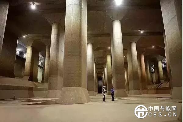 前4個豎井里導(dǎo)入的洪水通過下水道流入最后一個豎井,集中到由59根高18米、重500噸的大柱子撐起的巨大蓄水池中。