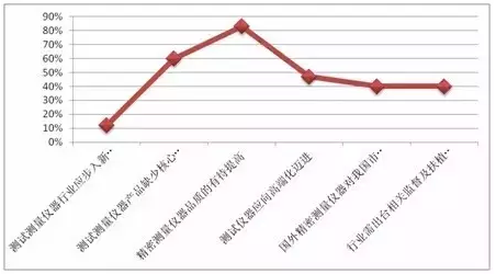 為在以上基礎(chǔ)上,廣泛征集行業(yè)人士建議,特圍繞“你對(duì)未來(lái)測(cè)試儀器儀表市場(chǎng)發(fā)展建議”進(jìn)行征集獲得,認(rèn)為測(cè)試測(cè)量?jī)x器行業(yè)應(yīng)步入新階段的占比為12%;認(rèn)為測(cè)試測(cè)量?jī)x器產(chǎn)品缺少核心技術(shù)占比為60%;認(rèn)為精密測(cè)量?jī)x器品質(zhì)的有待提高的占比為83%;認(rèn)為測(cè)試儀器應(yīng)向高端化邁進(jìn)的占比為47%;認(rèn)為國(guó)外精密測(cè)量?jī)x器對(duì)我國(guó)市場(chǎng)有顯著影響的占比40%;認(rèn)為行業(yè)需出臺(tái)相關(guān)監(jiān)督及扶植政策的占比40%。從圖中不難看出,產(chǎn)品質(zhì)量問(wèn)題是目前行業(yè)最關(guān)心的問(wèn)題,應(yīng)引起行業(yè)的足夠重視。