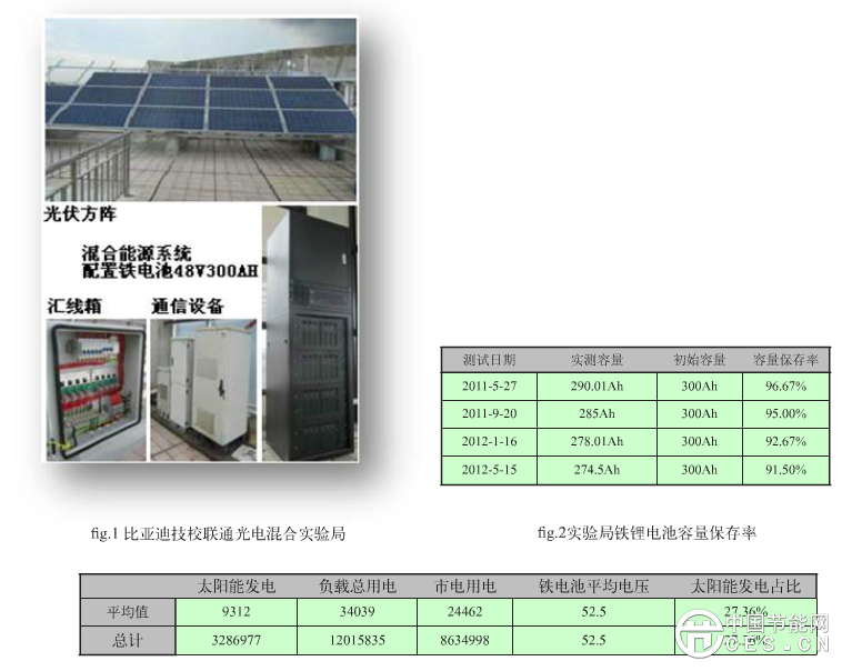 比亞迪技校聯(lián)通光電混合實驗局(鐵鋰電池工作環(huán)境為樓梯間、無空調(diào)、太陽直射),負載大約為1500W.優(yōu)先太陽能供電,即先使用太陽能供給負載,多余能量存入鐵鋰電池,在太陽能不足時,再由鐵鋰電池(放出儲存能量)提供負載用電。