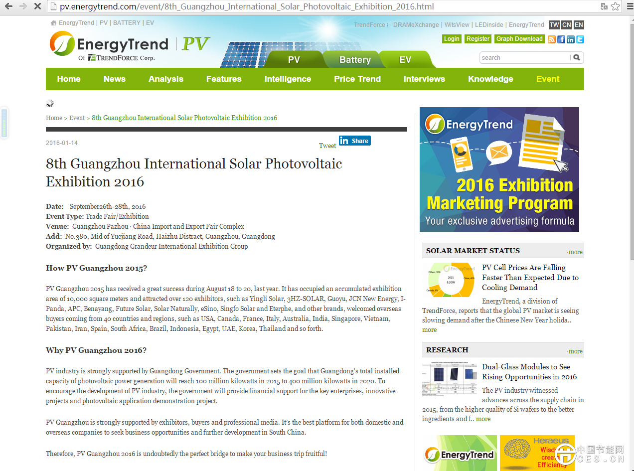 與此同時廣州國際光伏展還收獲了大量專業(yè)網(wǎng)站的宣傳支持。比如致力于可再生能源的西班牙行業(yè)內(nèi)領(lǐng)先專業(yè)網(wǎng)站Bio Economic,英國的Solar Business Hub,澳大利亞的PV Lighthouse,臺灣的Energy Trend,西班牙的AltEnergyMag,荷蘭的Energy Products,俄羅斯的Renewable Energy.com.ua,美國的Solar Server,印度的iData Insights,波蘭的Portalfotowoltaika.pl,以及知名網(wǎng)站PV Resources,E-Energy Market等。借助這些行業(yè)網(wǎng)站,使得廣州展的宣傳范圍不斷擴大。