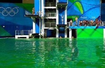 里約奧運會游泳場館上演神奇一幕,不知什么原因,泳池水由藍(lán)色變?yōu)榱司G色。女子雙人十米臺的決賽就是在這片泳池中進(jìn)行的,比賽過程中池水的顏色呈現(xiàn)深綠色,中國選手陳若琳和劉蕙瑕并未受到太大影響,最終獲得冠軍。