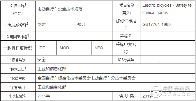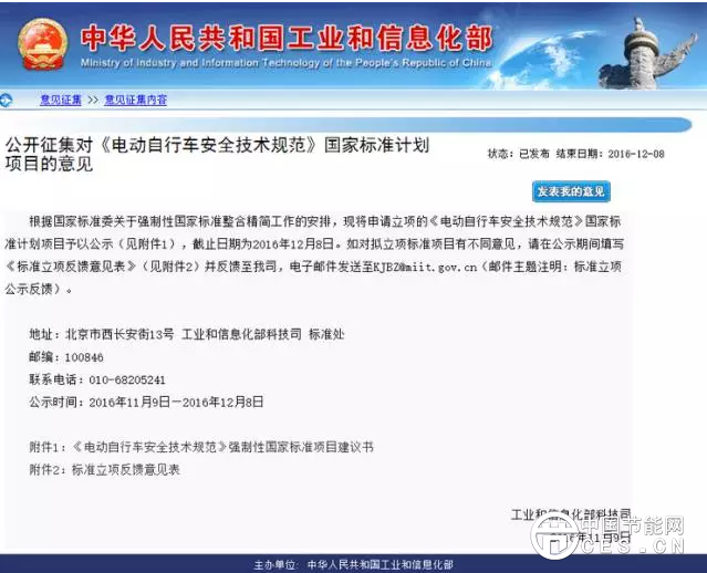 根據(jù)國(guó)家標(biāo)準(zhǔn)委關(guān)于強(qiáng)制性國(guó)家標(biāo)準(zhǔn)整合精簡(jiǎn)工作的安排,現(xiàn)將申請(qǐng)立項(xiàng)的《電動(dòng)自行車安全技術(shù)規(guī)范》國(guó)家標(biāo)準(zhǔn)計(jì)劃項(xiàng)目予以公示(見(jiàn)附件1),截止日期為2016年12月8日。如對(duì)擬立項(xiàng)標(biāo)準(zhǔn)項(xiàng)目有不同意見(jiàn),請(qǐng)?jiān)诠酒陂g填寫《標(biāo)準(zhǔn)立項(xiàng)反饋意見(jiàn)表》(見(jiàn)附件2)并反饋至我司,電子郵件發(fā)送至KJBZ@miit.gov.cn(郵件主題注明:標(biāo)準(zhǔn)立項(xiàng)公示反饋)。