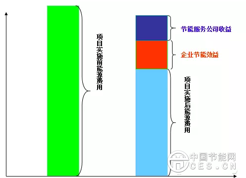 舉個栗子,我(節(jié)能服務(wù)公司)幫你做一個節(jié)能項目,可能涉及到更換設(shè)備以及設(shè)備的運行管理要花500W,但是不需要你投資,我先幫你做,做好之后你要把接下來三年節(jié)省的能源的一半都給我,上個圖說明一下: