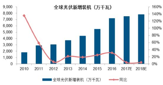 預(yù)計2017-2018 年全球光伏裝機(jī)將維持穩(wěn)態(tài)發(fā)展,年化增速在 5%左右