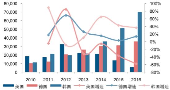 根據(jù)數(shù)據(jù),2016 年我國多晶硅進(jìn)口 14.1 萬噸,同比增長 25.67%,進(jìn)口規(guī)模占總消費(fèi)量的 40%以上。其中,從韓國進(jìn)口 7.01 萬噸,同比增長 36.92%;從德國進(jìn)口 3.57萬噸,同比增長 14.01%。從美國進(jìn)口 0.56 萬噸,同比減少 56.76%。