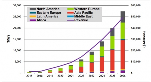 按地區(qū)分類的全球年度分布式、偏遠及離網(wǎng)太陽能(000591)光伏+儲能市場規(guī)模及供應(yīng)商營收,2017-2026年。圖片來源:Navigant市場調(diào)研公司