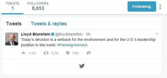 高盛CEO Lloyd Blankfein在六年前就注冊了Twitter賬號,但一直沒有發(fā)布任何內(nèi)容。在特朗普宣布將退出巴黎協(xié)定后,他終于忍不住了,稱“今天的決定,對于環(huán)境以及美國在世界的領(lǐng)導(dǎo)地位來說,都是一個打擊。”