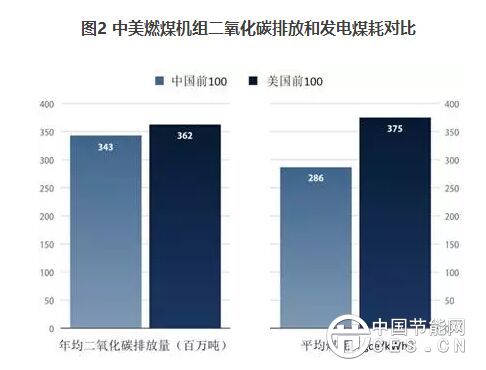 圖2 中美燃煤機(jī)組二氧化碳排放和發(fā)電煤耗對比