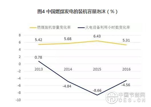 中國的能源規(guī)劃中包含了調(diào)整能源結(jié)構(gòu)的目標(biāo),中央政府也要求地方政府根據(jù)當(dāng)?shù)毓┬栊蝿莺蛧业哪茉匆?guī)劃核準(zhǔn)煤電項(xiàng)目。但結(jié)果卻是,各省之間展開煤電項(xiàng)目的建設(shè)競賽,電網(wǎng)公司分配給電廠的發(fā)電計(jì)劃指標(biāo)一再縮減,煤電機(jī)組的利用小時(shí)數(shù)也不斷下降。2016年,中國6 MW及以上火電廠的設(shè)備利用小時(shí)數(shù)降至近年來的最低水平(圖4)。