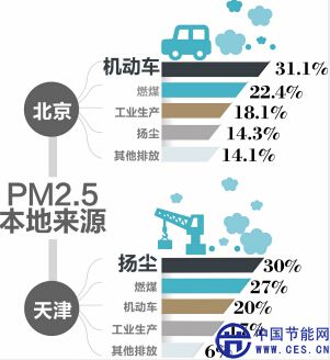 在北京本地PM2.5污染中,機(jī)動車、燃煤、工業(yè)生產(chǎn)、揚(yáng)塵為主要來源。機(jī)動車占31.1%,燃煤占22.4%,工業(yè)生產(chǎn)占18.1%,揚(yáng)塵占14.3%,餐飲、汽車修理、畜禽養(yǎng)殖、建筑涂裝等其他排放約占14.1%。