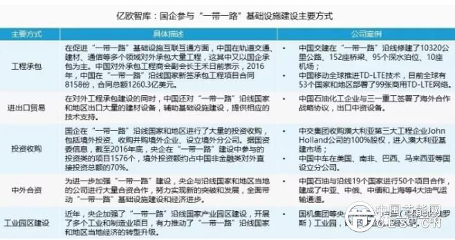基礎(chǔ)設(shè)施建設(shè)是“一帶一路”發(fā)展的基礎(chǔ)核心環(huán)節(jié),分為鐵路、公路等交通建設(shè)和通訊網(wǎng)絡(luò)建設(shè)。自“一帶一路”倡議提出三年以來(lái),國(guó)企發(fā)揮自身優(yōu)勢(shì),在沿線國(guó)家修建大批交通和通信設(shè)施。跟據(jù)國(guó)資委公開(kāi)資料顯示,目前累計(jì)有47家央企參與、參股、投資、或和相關(guān)國(guó)家的企業(yè)合作共建了總計(jì)1676個(gè)項(xiàng)目,有利促進(jìn)了“一帶一路”沿線國(guó)家經(jīng)濟(jì)社會(huì)發(fā)展。具體國(guó)企基礎(chǔ)設(shè)施建設(shè)方式如下表。