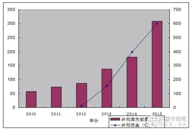 目前,環(huán)保行業(yè)的整合并購趨勢(shì)明顯,資金規(guī)模由2012年的12億元急增到2015年的600億元,集中在較成熟的水務(wù)和固體廢棄物行業(yè)。非節(jié)能環(huán)保企業(yè)的跨界收購也大量涌現(xiàn),達(dá)總資金規(guī)模的25%。中國(guó)石油化工集團(tuán)公司、中國(guó)中鐵四局集團(tuán)有限公司等,通過資本、技術(shù)、工程和設(shè)備等途徑紛紛進(jìn)軍節(jié)能環(huán)保產(chǎn)業(yè),隨著行業(yè)并購規(guī)模進(jìn)一步擴(kuò)大,業(yè)內(nèi)兼并重組將形成行業(yè)龍頭的相對(duì)壟斷競(jìng)爭(zhēng)格局,而跨行業(yè)重組則會(huì)帶來產(chǎn)業(yè)鏈條的延伸。
