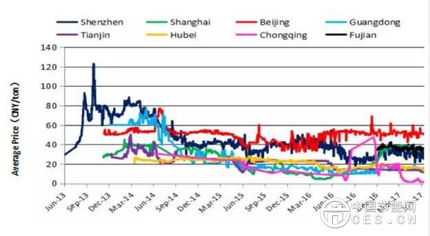 中國碳市場試點碳價每日平均價格(元/噸),2013年6月18日-2017年6月30日)圖片來源:中國碳論壇《2017年中國碳價調(diào)查》