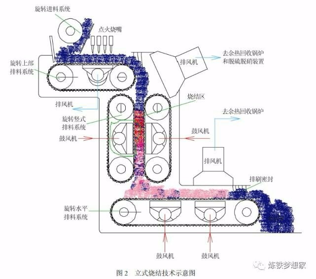 混合料經(jīng)上部排料系統(tǒng)用燒嘴點(diǎn)燃后進(jìn)入循環(huán)移動(dòng)的豎式排料系統(tǒng),在豎式排料區(qū)上部的燒結(jié)區(qū)進(jìn)行穩(wěn)定的燒結(jié)過(guò)程,礦料點(diǎn)燃后點(diǎn)火燒嘴關(guān)閉。燒結(jié)過(guò)程需要的風(fēng)量由兩側(cè)鼓風(fēng)機(jī)鼓入,經(jīng)上部排風(fēng)機(jī)排出后去余熱回收鍋爐和脫硫脫硝系統(tǒng)。燒結(jié)后的燒結(jié)料經(jīng)循環(huán)移動(dòng)的豎式排料系統(tǒng)送到循環(huán)水平排料系統(tǒng)進(jìn)一步被冷卻到出料溫度排出燒結(jié)系統(tǒng)。