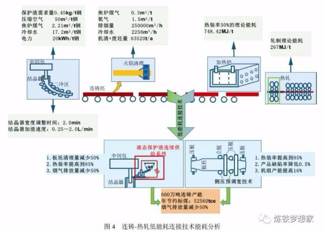 (1)結(jié)晶器熔融保護(hù)渣連續(xù)供給技術(shù)[13],使得連鑄過(guò)程完全在熔融保護(hù)渣下進(jìn)行,不會(huì)因保護(hù)渣熔化不良帶來(lái)夾渣缺陷,同時(shí)當(dāng)連鑄機(jī)拉速增大時(shí),熔融保護(hù)渣確保結(jié)晶器的潤(rùn)滑效果;(2)在連鑄與熱軋之間設(shè)置一套獨(dú)立的板坯自由寬度調(diào)節(jié)裝置[14],將連鑄機(jī)調(diào)寬功能與熱軋線的初軋機(jī)調(diào)寬功能都?xì)w結(jié)到一處,連鑄機(jī)只生產(chǎn)一種規(guī)格的板坯,保持連鑄機(jī)一直處于穩(wěn)定工作狀態(tài)。熱軋初軋機(jī)只進(jìn)行微量調(diào)寬??蛇_(dá)到兩個(gè)目的:(1)使得連鑄機(jī)在最大產(chǎn)能下保持穩(wěn)定生產(chǎn),減少或消除鑄坯缺陷,消除過(guò)渡坯。(2)將熱軋初軋機(jī)調(diào)寬功能上移到該調(diào)寬裝置,擴(kuò)展初軋機(jī)的產(chǎn)能,降低初軋機(jī)能耗。圖4 示出連鑄-熱軋低能耗連接技術(shù)能耗分析。