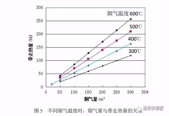 工業(yè)爐(加熱爐、熱處理爐)煙氣排放帶走的熱量占工業(yè)爐總能耗20%~26%。減少煙氣排放量能夠大幅度降低工業(yè)爐能耗。當(dāng)煙氣溫度為600℃時(shí),煙氣量從300m3/h 降到150m3/h,熱量損失減少50%(見圖5)。而且煙氣排放管道大幅度減小。