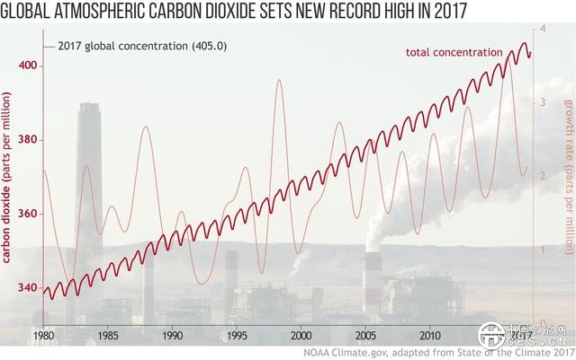 自18世紀(jì)中葉工業(yè)革命開始以來,全球CO2排放量顯著增加,據(jù)估計,已增加了45%以上。美國海洋大氣管理局(NOAA)近日公布了2017年全球CO2濃度數(shù)據(jù),指出2017年全球大氣C02濃度為百萬分之405.0±0.1(405.0±0.1ppm),創(chuàng)下全球觀測史上新高。