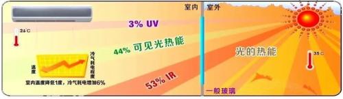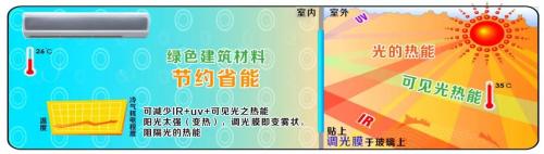 國(guó)安奇緯自主研發(fā)十余年的核心材料——節(jié)能型調(diào)光膜,已取得多國(guó)知識(shí)產(chǎn)權(quán)。能有效隔離UV與IR,達(dá)到透光不透熱的效果。當(dāng)光透過(guò)玻璃帷幕射入室內(nèi),產(chǎn)生大量熱能。如要調(diào)低冷氣溫度,每降低1℃,則需增加消耗電能6%。因此,戶外溫度過(guò)高,使用節(jié)能型調(diào)光膜調(diào)整在霧狀情況下,可確保室內(nèi)相對(duì)涼爽。節(jié)能型調(diào)光膜黏貼在您的玻璃上,隔熱效果良好。相關(guān)示意圖如下: