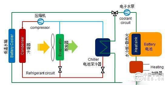 一個(gè)典型的電池?zé)峁芾硐到y(tǒng)冷卻器主要包含Chiller、電池水冷板、低溫水箱。