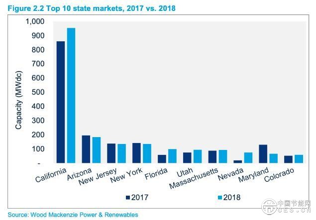 在一些州,非住宅市場(chǎng)的下滑是由政策變化推動(dòng)的,如馬薩諸塞州,等待推出可再生能源目標(biāo)計(jì)劃,最終導(dǎo)致該州裝機(jī)同比下降64%。但是,住宅市場(chǎng)卻是“風(fēng)景這邊獨(dú)好”,完成了2.4GW的新增裝機(jī),盡管還未回歸2016年的水平,但是相比2017年增長(zhǎng)7%。其中亞利桑那州、新澤西州和紐約還處于低迷狀態(tài),但加州裝機(jī)回升至近1GW,佛羅里達(dá)州成為第五大住宅市場(chǎng)。