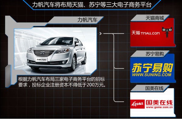 根據(jù)力帆汽車(chē)布局三家電子商務(wù)平臺(tái)的招標(biāo)要求,投標(biāo)企業(yè)注冊(cè)資本不得低于200萬(wàn)元,同時(shí)向力帆汽車(chē)提交年度運(yùn)營(yíng)方案、旗艦店鋪設(shè)計(jì)圖以及店鋪推廣策略等多項(xiàng)運(yùn)營(yíng)建設(shè)工作。在力帆汽車(chē)挑選符合要求的企業(yè)單位后,供應(yīng)商將在天貓商城、蘇寧易購(gòu)以及國(guó)美在線(xiàn)三大平臺(tái)上進(jìn)行力帆汽車(chē)和零部件的直銷(xiāo)。