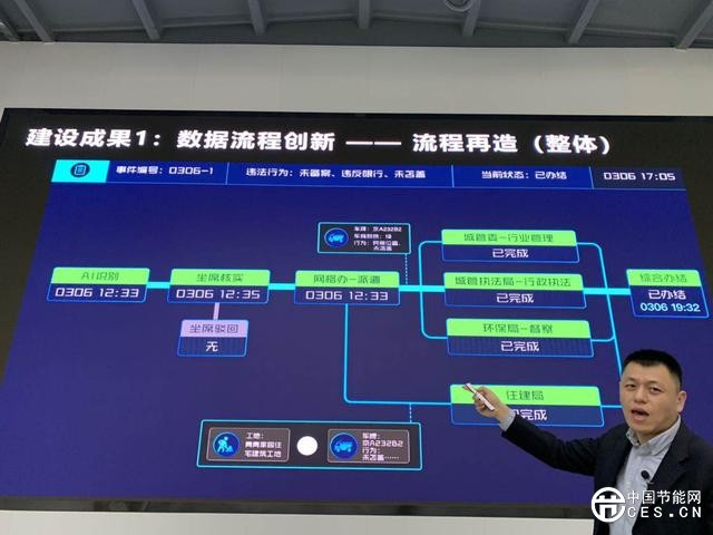 今天下午,記者在通州區(qū)城市管理指揮分中心的大廳內(nèi)看到,通州生態(tài)環(huán)境綜合治理平臺的藍(lán)色大屏幕覆蓋了大廳的整面墻壁,上面正實時滾動著視頻監(jiān)控報送上來的信息和處置情況。張良在大屏幕上現(xiàn)場為記者演示了平臺依靠人工智能發(fā)現(xiàn)和處置未苫蓋渣土車的模擬場景全過程。12點33分,一輛京A牌照的綠色渣土車被視頻監(jiān)控探頭發(fā)現(xiàn)存在未苫蓋行為,屏幕上立刻顯示出,這輛渣土車是從青青家園住宅建筑工地駛出的;12點33分,沒有任何遲疑,網(wǎng)格辦已經(jīng)將這一問題直接派遣到了城管委、城管執(zhí)法局、環(huán)保局和住建局這4個部門;晚上7點32分,4個部門已經(jīng)將這輛渣土車未苫蓋的問題處置辦結(jié)完畢。
