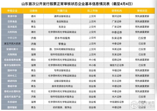 記者整理證監(jiān)會最新更新的首發(fā)企業(yè)基本信息情況表發(fā)現(xiàn),截至4月4日,共有18家山東企業(yè)處于正常審核狀態(tài)中。除去此次成功過會的惠城環(huán)保,排隊的山東企業(yè)還有17家(如下圖):