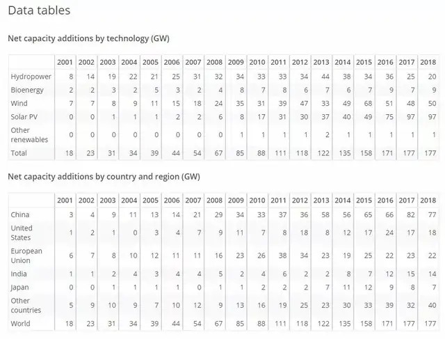 2018年是自2001年以來可再生能源發(fā)電能力首次未能同比增長的年份。根據(jù)國際能源署IEA的最新數(shù)據(jù),2018年,來自光伏、風(fēng)能、水電、生物能源和其他可再生能源的裝機(jī)容量同比增長約180吉瓦。這僅僅是實(shí)現(xiàn)長期氣候目標(biāo)每年所需凈增量的60%左右。