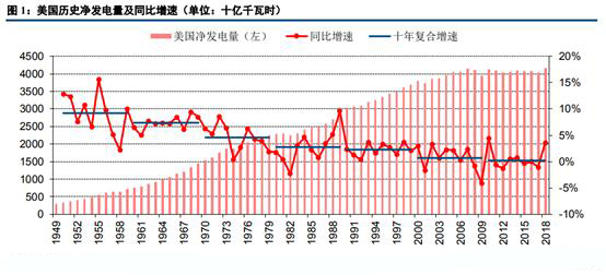 為方便分析不同階段的電力工業(yè)發(fā)展,我們將發(fā)電增速在8%左右的階段定義為快速增長(zhǎng)期,發(fā)電增速穩(wěn)定在3%左右的階段定義為穩(wěn)定成長(zhǎng)期,發(fā)電量基本無(wú)增長(zhǎng)的階段定義為成熟期。從美國(guó)電力工業(yè)近年來(lái)凈發(fā)電量復(fù)合增速的數(shù)據(jù)來(lái)看,1949年至1969年間美國(guó)的十年復(fù)合發(fā)電增速分別為9.2%、7.3%,電力工業(yè)仍處于快速增長(zhǎng)期。1970年到1999年間美國(guó)的十年復(fù)合發(fā)電增速分別為4.5%、2.8%、2.2%,發(fā)電增速降檔明顯,基本上圍繞3%左右波動(dòng),處于穩(wěn)定成長(zhǎng)期。2000年至今,美國(guó)的十年復(fù)合發(fā)電增速分別為0.7%、0.1%,發(fā)電量基本無(wú)增長(zhǎng),美國(guó)電力工業(yè)已步入成熟期。