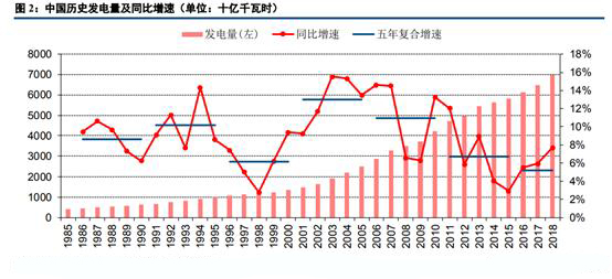 1、對(duì)比美國(guó)歷史七十年發(fā)電量數(shù)據(jù)和中國(guó)歷史35年發(fā)電量數(shù)據(jù)可以看出,近年來(lái)美國(guó)發(fā)電量基本無(wú)增長(zhǎng),電力工業(yè)處于成熟期;中國(guó)發(fā)電增速面臨換擋,或?qū)@5%這一中樞波動(dòng),有可能正式進(jìn)入穩(wěn)定成長(zhǎng)期,對(duì)標(biāo)美國(guó)70年代到90年代的情況;