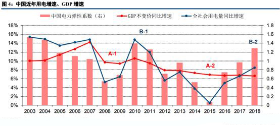 在分析中美當(dāng)前電力工業(yè)發(fā)展分別處于哪一階段之后,我們?cè)偻ㄟ^一系列細(xì)化的發(fā)用電指標(biāo),進(jìn)一步對(duì)比中美電力工業(yè)當(dāng)前發(fā)展的異同。首先從用電量角度出發(fā),觀察中國(guó)近年的GDP增速、用電增速和電力彈性系數(shù)的變化情況。從歷史數(shù)據(jù)來(lái)看,中國(guó)用電量在2003年—2011年保持了兩位數(shù)的高增長(zhǎng)(剔除2008年經(jīng)濟(jì)危機(jī)影響),之后用電增速持續(xù)回落,至2015年后觸底回升。整體來(lái)看,我國(guó)GDP增速與用電增速趨勢(shì)較為同步,用電增速波動(dòng)幅度相對(duì)較大。從電力彈性系數(shù)的角度分析,當(dāng)經(jīng)濟(jì)增速下滑時(shí),用電增速下滑幅度往往大于GDP增速,導(dǎo)致電力彈性系數(shù)偏?。ˋ-1、A-2兩階段);當(dāng)經(jīng)濟(jì)有所回暖時(shí),用電增速的反彈幅度同樣大于GDP增速,導(dǎo)致電力彈性系數(shù)偏大(B-1、B-2兩階段)。我們判斷我國(guó)用電增速波動(dòng)大的主要原因在于第二產(chǎn)業(yè)用電占比較高且二產(chǎn)對(duì)于經(jīng)濟(jì)增長(zhǎng)更為敏感。