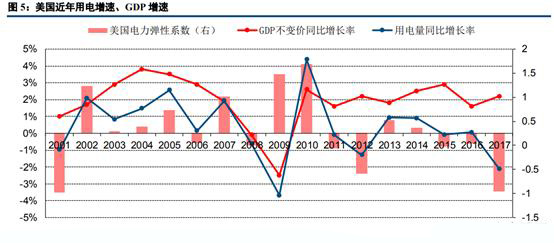 從美國(guó)的GDP增速、用電增速和電力彈性系數(shù)的變化情況來(lái)看,美國(guó)作為發(fā)達(dá)國(guó)家,其經(jīng)濟(jì)增長(zhǎng)與用電增速相對(duì)較為穩(wěn)定,波動(dòng)幅度遠(yuǎn)小于中國(guó)。2011年以來(lái),美國(guó)GDP增速保持2%左右波動(dòng),而用電增速在±1%的區(qū)間內(nèi)窄幅震蕩,用電量增長(zhǎng)和經(jīng)濟(jì)增長(zhǎng)基本沒有明顯相關(guān)性。從電力彈性系數(shù)也看出,美國(guó)電力彈性系數(shù)較為無(wú)序,預(yù)示其經(jīng)濟(jì)增長(zhǎng)對(duì)電力消費(fèi)推動(dòng)的影響明顯減小。
