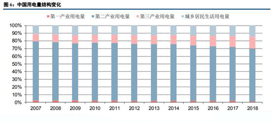 接下來(lái)我們對(duì)比分析中美用電量結(jié)構(gòu)情況。2018年我國(guó)全社會(huì)用電量為68449億千瓦時(shí),同比增長(zhǎng)8.49%;第二產(chǎn)業(yè)用電量為47235億千瓦時(shí),同比增長(zhǎng)7.17%。從我國(guó)近十年來(lái)的用電結(jié)構(gòu)變化來(lái)看,第二產(chǎn)業(yè)用電占比由80%下滑到70%左右,其釋放出的用電空間主要由第三產(chǎn)業(yè)用電及城鄉(xiāng)居民生活用電瓜分。未來(lái)隨著我國(guó)經(jīng)濟(jì)結(jié)構(gòu)持續(xù)轉(zhuǎn)型,高耗能產(chǎn)業(yè)對(duì)用電增長(zhǎng)的拉動(dòng)效應(yīng)有望逐步弱化,第二產(chǎn)業(yè)用電占比仍將持續(xù)小幅下降。