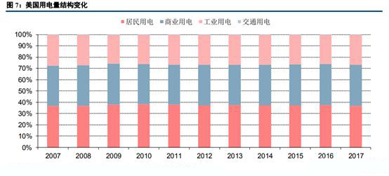 目前美國(guó)用電量基本上穩(wěn)定在37000億千瓦時(shí)(不考慮1400億千瓦時(shí)的廠用電及線損)左右。美國(guó)用電結(jié)構(gòu)劃分與中國(guó)有所不同,其用電劃分為居民、商業(yè)、工業(yè)及交通,2017年分別占總用電量比例為37%、36.3%、26.4%和0.2%。從趨勢(shì)上看,工業(yè)占比有小幅下滑,但整體用電結(jié)構(gòu)保持相對(duì)穩(wěn)定。