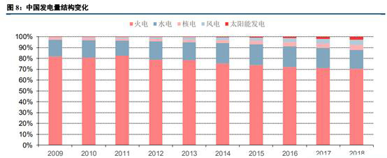 接下來(lái)我們從發(fā)電量及電力裝機(jī)結(jié)構(gòu)等角度對(duì)比中美電力供應(yīng)側(cè)的不同。2018年中國(guó)火電發(fā)電量為49231億千瓦時(shí),同比增長(zhǎng)7.3%(中電聯(lián)口徑,與統(tǒng)計(jì)局口徑范圍不同),占總發(fā)電量比重為70.4%。雖然火電仍然為最主要的發(fā)電電源,但其占比已從2009年的81.8%下滑了11.4個(gè)百分點(diǎn)。水電發(fā)電量受氣候因素影響存在一定波動(dòng),占比相對(duì)較為穩(wěn)定。核電、風(fēng)電、太陽(yáng)能等新能源發(fā)電增速及發(fā)電占比提升較快,對(duì)火電的替代效應(yīng)十分明顯。