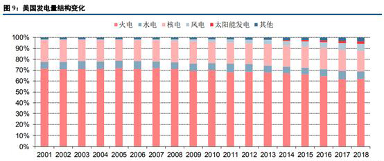 美國(guó)發(fā)電量結(jié)構(gòu)變化情況與中國(guó)較為類似,火電發(fā)電量占比從2001年的71.7%下降到2018年的62.1%。核電、水電分別是美國(guó)的第二和第三大發(fā)電電源,兩者占比相對(duì)穩(wěn)定。風(fēng)電及太陽(yáng)能對(duì)火電的替代效應(yīng)較為明顯。中美發(fā)電量數(shù)據(jù)的不同之處在于美國(guó)火電及核電發(fā)電量多年來(lái)幾乎維持零增長(zhǎng),風(fēng)電及太陽(yáng)能以搶占少量的新增用電需求為主;而中國(guó)各項(xiàng)電源占比結(jié)構(gòu)雖然有所分化,但各類電源發(fā)電量仍然維持正增長(zhǎng)。