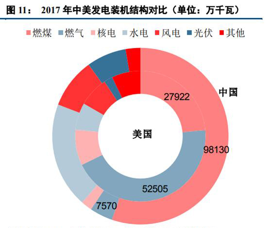 中國(guó)發(fā)電裝機(jī)結(jié)構(gòu)變化趨勢(shì)與發(fā)電量結(jié)構(gòu)趨勢(shì)一致,風(fēng)電及光伏的替代效果更加明顯。從2017年中美發(fā)電裝機(jī)對(duì)比來(lái)看,盡管中美電力裝機(jī)均以火電為主(美國(guó)燃煤及燃?xì)庋b機(jī)占比68%,中國(guó)火電裝機(jī)占比59.5%),但其細(xì)分發(fā)電裝機(jī)情況仍有很大的不同。美國(guó)燃?xì)獍l(fā)電裝機(jī)達(dá)52505萬(wàn)千瓦,占比44%,是美國(guó)最主要的電源;而中國(guó)發(fā)電機(jī)組仍以燃煤為主,煤電裝機(jī)占比達(dá)55%。受美國(guó)頁(yè)巖氣革命影響,疊加燃?xì)廨啓C(jī)發(fā)電技術(shù)的不斷進(jìn)步,美國(guó)燃?xì)獍l(fā)電成本大幅下降,而燃煤機(jī)組受制于相關(guān)環(huán)保政策的要求,運(yùn)營(yíng)成本無(wú)法與燃?xì)?、風(fēng)能、核能等清潔能源正面競(jìng)爭(zhēng)。據(jù)相關(guān)新聞報(bào)道,過去10年美國(guó)關(guān)閉了近一半的燃煤電廠。