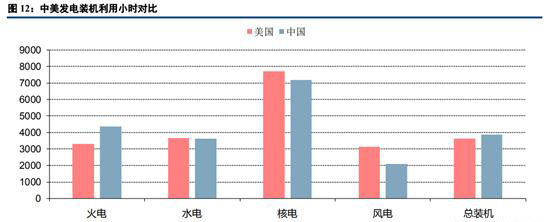 從中美發(fā)電裝機(jī)利用小時(shí)對(duì)比來(lái)看,由于美國(guó)火電裝機(jī)中燃機(jī)占比較高,所以其總裝機(jī)利用小時(shí)和火電利用小時(shí)均低于中國(guó)。其核電及風(fēng)電受益于消納條件較好及資源稟賦,利用小時(shí)高于中國(guó)。