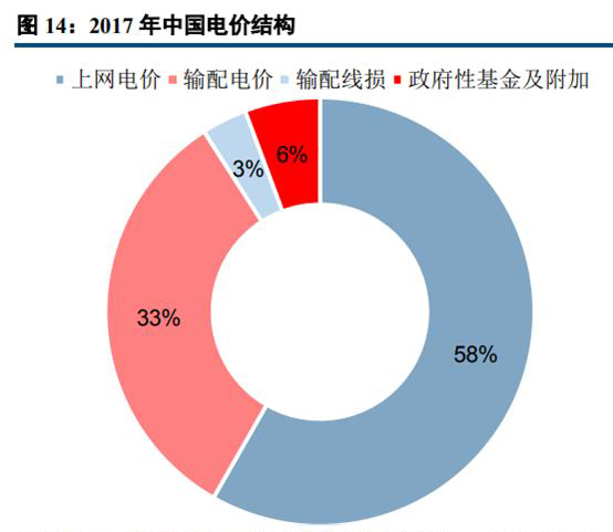 我國(guó)銷售電價(jià)構(gòu)成主要包括上網(wǎng)電價(jià)、輸配電價(jià)、輸配線損和政府性基金及附加。根據(jù)發(fā)改委2017年電力價(jià)格監(jiān)管相關(guān)通告數(shù)據(jù),電網(wǎng)企業(yè)平均含稅銷售電價(jià)為0.6091元/千瓦時(shí)(不含政府性基金及附加)。對(duì)于下游用戶綜合用電電價(jià)而言,其由發(fā)電企業(yè)上網(wǎng)電價(jià)(0.3763元/千瓦時(shí))、輸配電價(jià)(0.2107元/千瓦時(shí))、輸配電線損(0.02213元/千瓦時(shí))和政府性基金及附加(0.0366元/千瓦時(shí)),合計(jì)為0.6457元/千瓦時(shí)。從占比來(lái)看,上網(wǎng)電價(jià)、輸配電價(jià)、輸配線損和政府性基金及附加占比分別為58%、33%、3%和6%。