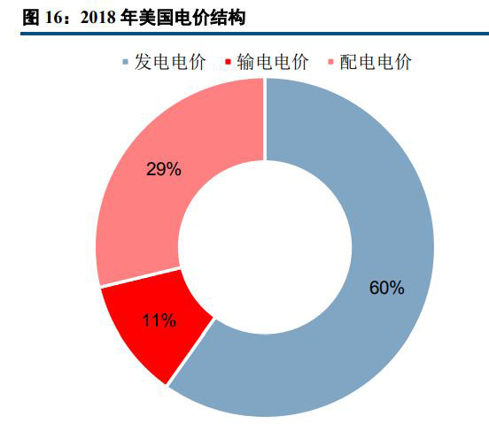 而美國(guó)的銷售電價(jià)主要由發(fā)電電價(jià)、輸電電價(jià)以及配電電價(jià)構(gòu)成。2018年美國(guó)終端用電價(jià)格為10.85美分/千瓦時(shí),其由上網(wǎng)電價(jià)(6.49美分/千瓦時(shí))、輸電電價(jià)(1.24美分/千瓦時(shí))和配電電價(jià)(3.12美分/千瓦時(shí))構(gòu)成,三者占比分別為60%、11%和29%。